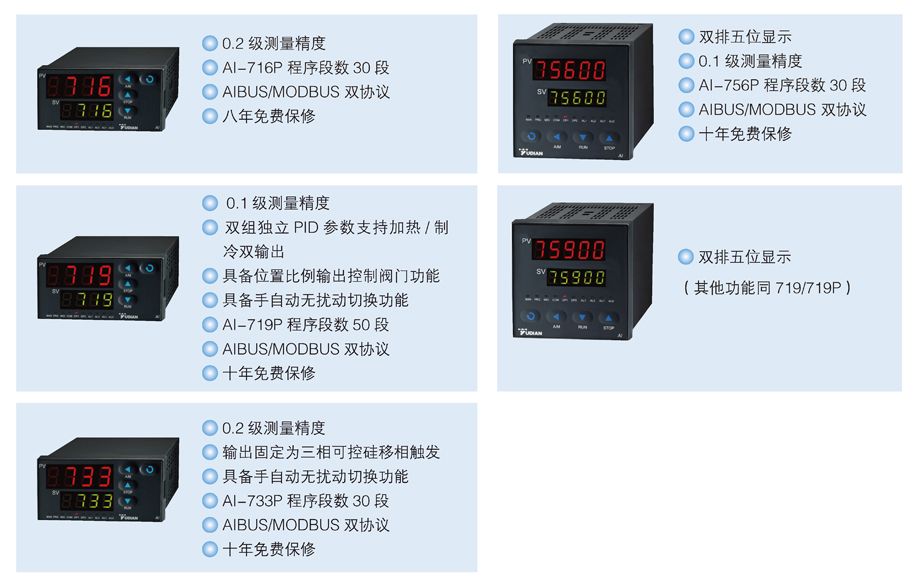AI系列高性能人工智能溫度控制器/調(diào)節(jié)器——精確穩(wěn)定、功能強(qiáng)大、環(huán)保節(jié)能的人工智能溫度控制器/調(diào)節(jié)器,適用于節(jié)能環(huán)保及控制精度要求高的用戶。除具備通用型儀表的所有功能外,儀表還可以直接實(shí)現(xiàn)三相三線移相觸發(fā)輸出(AI-733/719 型)及位置比例輸出控制閥門電機(jī)正/反轉(zhuǎn)、組成串級(jí)或比例調(diào)節(jié)復(fù)雜系統(tǒng)等豐富功能(AI-719/759 型)。